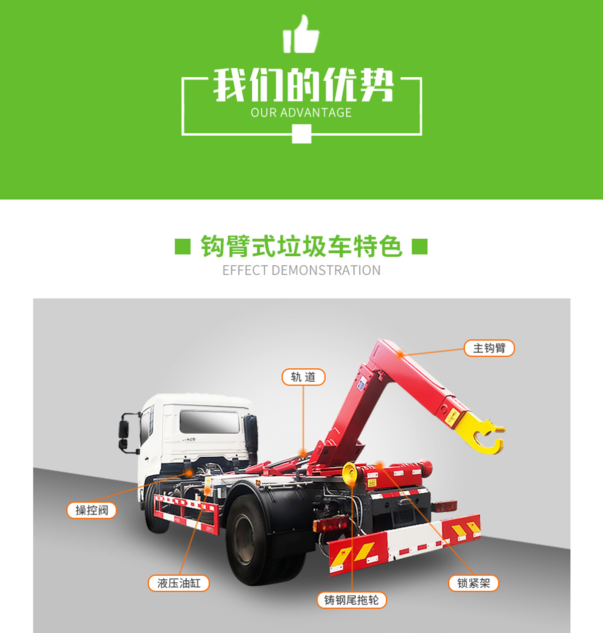 底盤配置:柳機113馬力,1650單排駕駛室,5檔變速箱,175R14真空輪胎【后雙輪】,前后橋1.5/2.5。標配動力轉向,前盤制動,中控門鎖,電動門窗,定速巡航,藍牙電話,LED日間行車燈,空調,預留取力器窗口。 上裝配置:勾臂垃圾車標配:由液壓系統、操作系統、拉臂,組成。舉升油制缸為國內知名液壓件廠家生產的雙作用油缸,多路閥液壓控制,操作員手動控制垃圾廂吊上放下,帶自卸功能,上下一次工作循環時間≤40秒。垃圾箱冷板壓制垃圾箱,帶后門密封圈,帶金屬滾動輪。 |