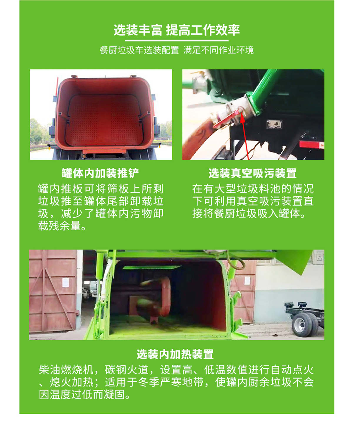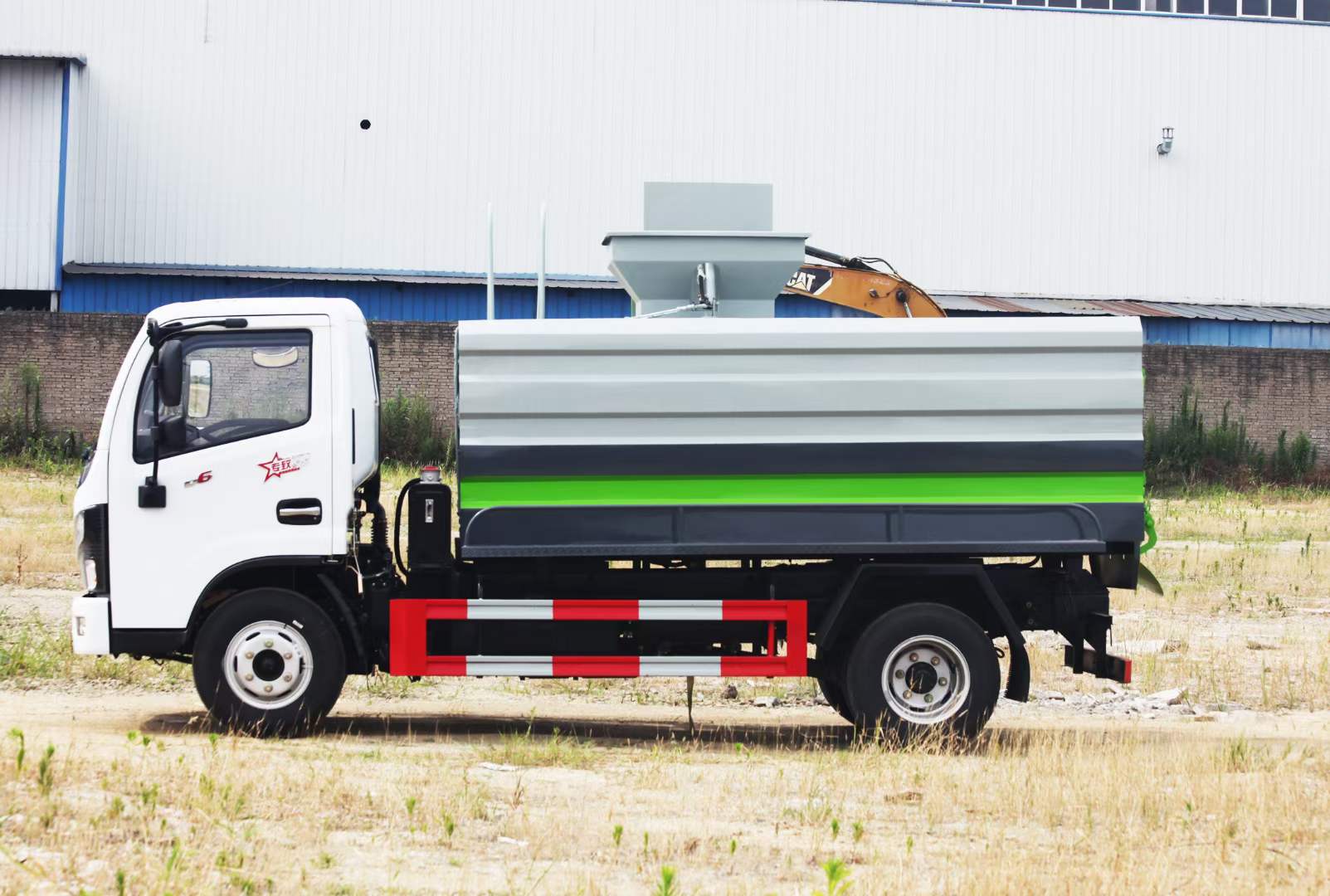 其它:箱體整體舉升自卸卸料,側(cè)方鏈條式120L或240L塑料桶提升機(jī),箱體頂部靠尾部開50*50進(jìn)料口,頂部進(jìn)料口為液壓開啟,后門卸料口為液壓開啟,中梅多路閥,手動(dòng)操作,可加裝加熱裝置。