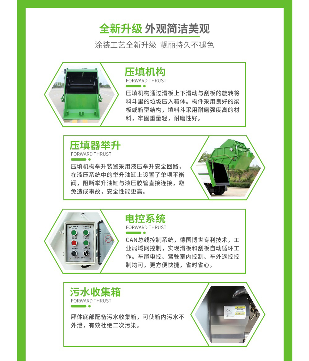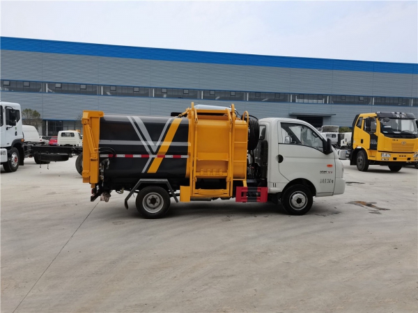 上裝配置:廂體有效容積約4立方米,側裝掛桶提升機構,可定制提升120L或240L垃圾桶,內帶全推板,尾部液壓開啟。